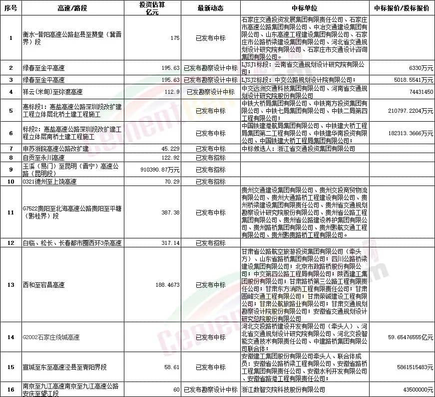 據(jù)水泥人網(wǎng)不完全統(tǒng)計(jì),近期已發(fā)中標(biāo)或招標(biāo)信息的16條重點(diǎn)高速總投資1929.19億元;