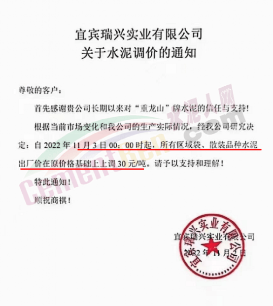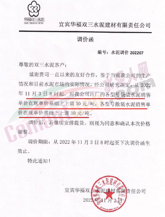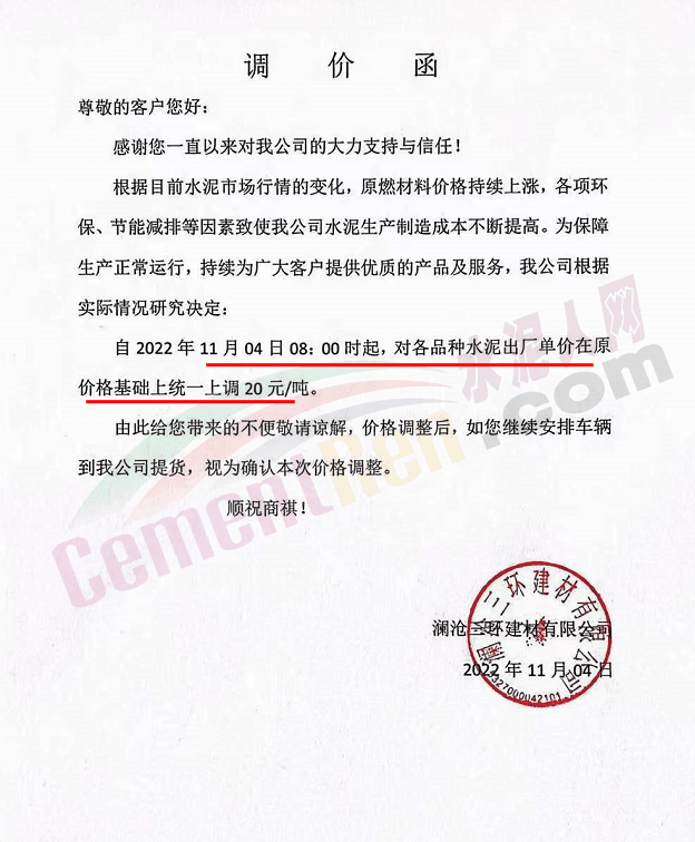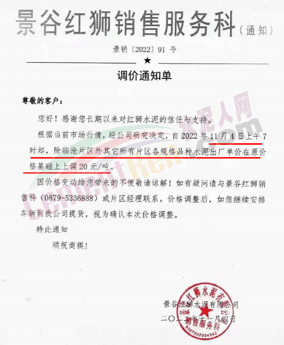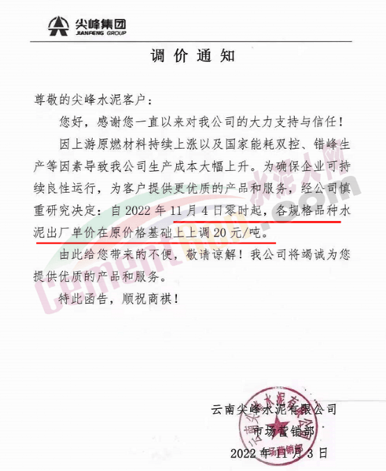 11月3日云南尖峰水泥有限公司市場(chǎng)營(yíng)銷部通知,因上游原燃材料持續(xù)上漲以及國(guó)家能耗雙控、錯(cuò)峰生產(chǎn)等因素導(dǎo)致公司生產(chǎn)成本大幅上升。為確保企業(yè)可持續(xù)良性運(yùn)行,為客戶提供更優(yōu)質(zhì)的產(chǎn)品和服務(wù),經(jīng)公司慎重研究決定自2022年11月4日零時(shí)起,各規(guī)格品種水泥出廠單價(jià)在原價(jià)格基礎(chǔ)上上調(diào)20元/噸。