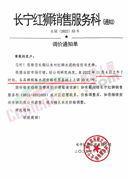 長(zhǎng)寧紅獅銷售服務(wù)科通知,根據(jù)當(dāng)前市場(chǎng)行情,經(jīng)公司研究決定,自2022年11月4日上午7 時(shí)起,各品牌規(guī)格水泥價(jià)格在原基礎(chǔ)上上調(diào)30元/噸。