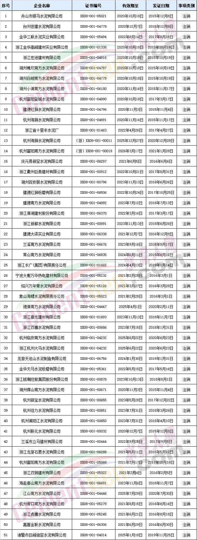 浙江省51個編號水泥生產(chǎn)許可證處于注銷狀態(tài);