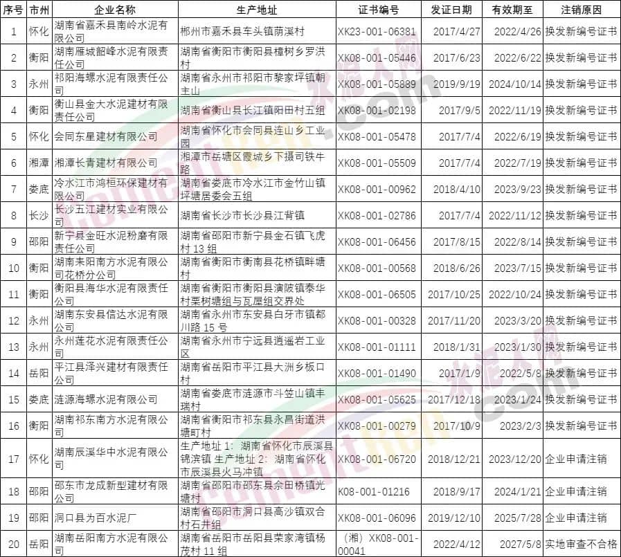 湖南省20家企業(yè)生產(chǎn)許可證注銷,16家水泥企業(yè)換發(fā)新編號證書,3家企業(yè)申請注銷,1家企業(yè)實地審查不合格;