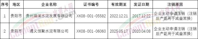 貴州省注銷工業(yè)產(chǎn)品生產(chǎn)許可證2家,均為企業(yè)主動申請注銷(注銷后產(chǎn)能用于減量置換);