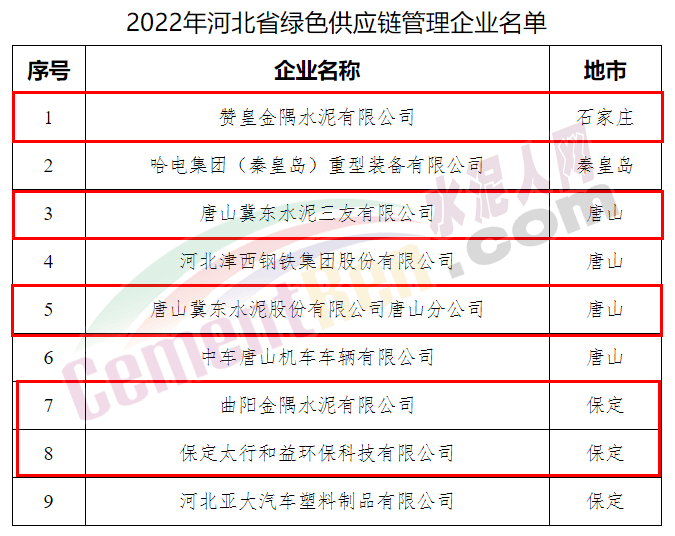 2022年河北省綠色供應(yīng)鏈管理企業(yè)名單中包含贊皇金隅水泥有限公司、唐山冀東水泥三友有限公司、唐山冀東水泥股份有限公司唐山分公司、曲陽金隅水泥有限公司、保定太行和益環(huán)保科技有限公司等5家水泥企業(yè)。