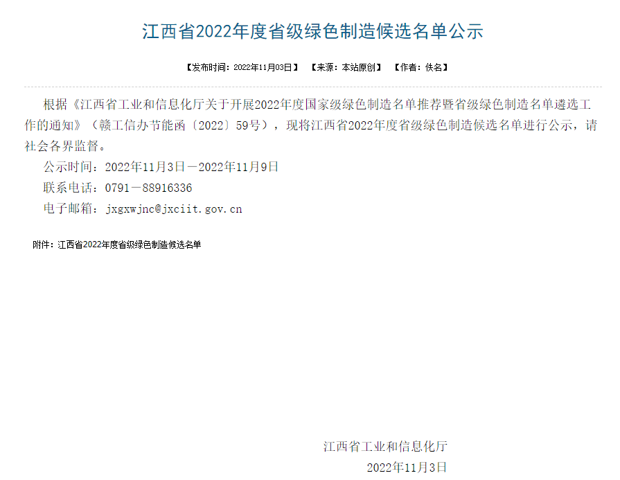 11月3日,江西省工信廳公布《2022年度省級綠色制造候選名單》71家綠色工廠名單中包括江西德安萬年青水泥有限公司、江西湖口萬年青水泥有限公司、江西樂平萬年青水泥有限公司、贛州海螺水泥有限責任公司、贛州海螺水泥有限責任公司龍南市分公司等5家水泥企業(yè)。