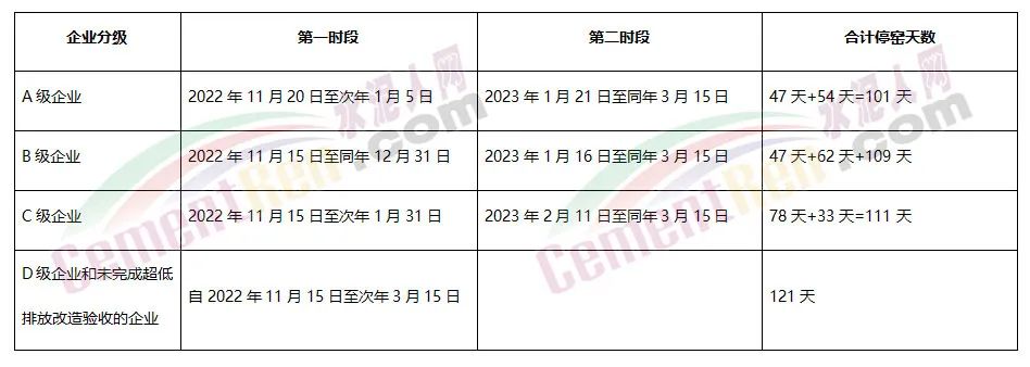 采暖期通用水泥熟料生產線錯峰生產時間按照企業(yè)環(huán)??冃У燃壴u定結果分別安排,停產時間從63天~121天不等。其中A級企業(yè)定于2022年11月20日至次年1月5日和2023年1月21日至同年3月15日兩個時段分別停窯47天和54天,采暖期停窯101天;D級企業(yè)和未完成超低排放改造驗收的企業(yè),自2022年11月15日至次年3月15日,采暖期共停121天。
