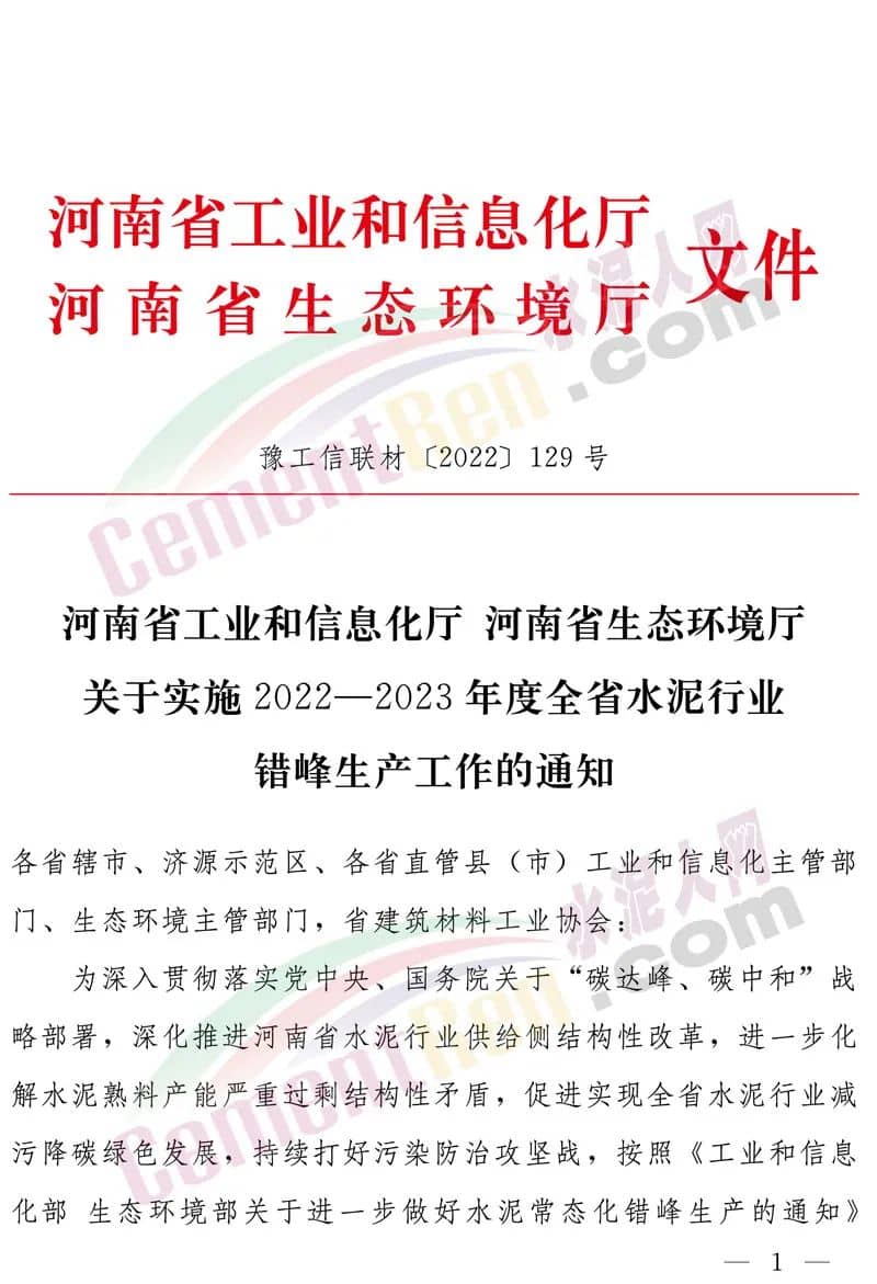 寧夏回族自治區(qū)工信廳發(fā)布《 關于2022-2023年冬春季部分重點工業(yè)行業(yè)開展錯峰生產的通知》要求全區(qū)所有水泥熟料生產企業(yè) 2022年11月1日-2023年3月10日期間錯峰生產130天,時限內未完成錯峰生產的天數(shù)在2023年6月底前補足。