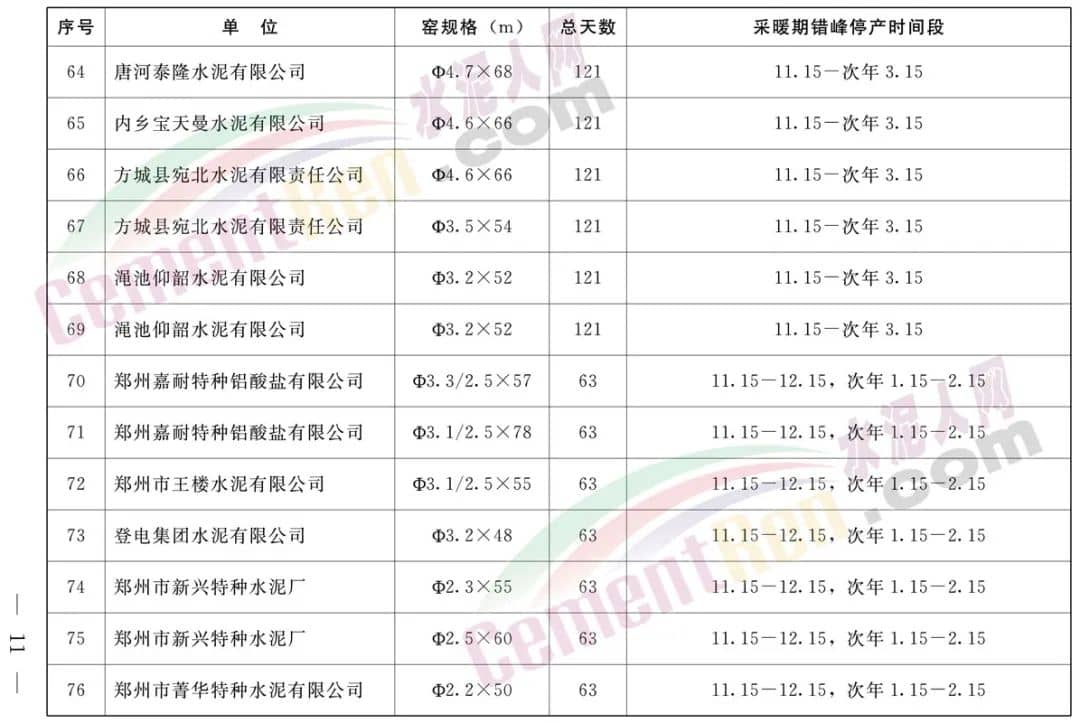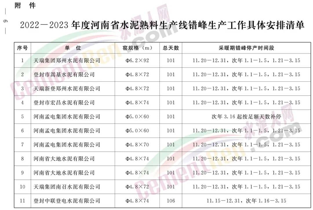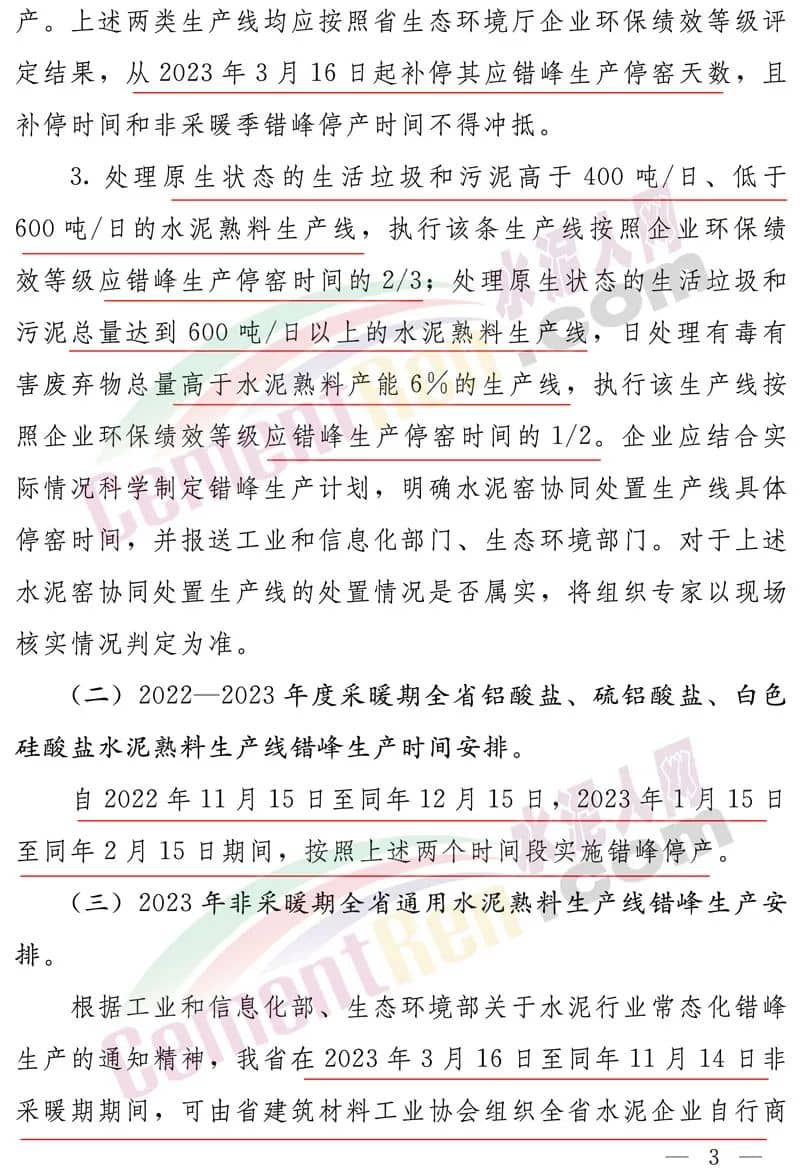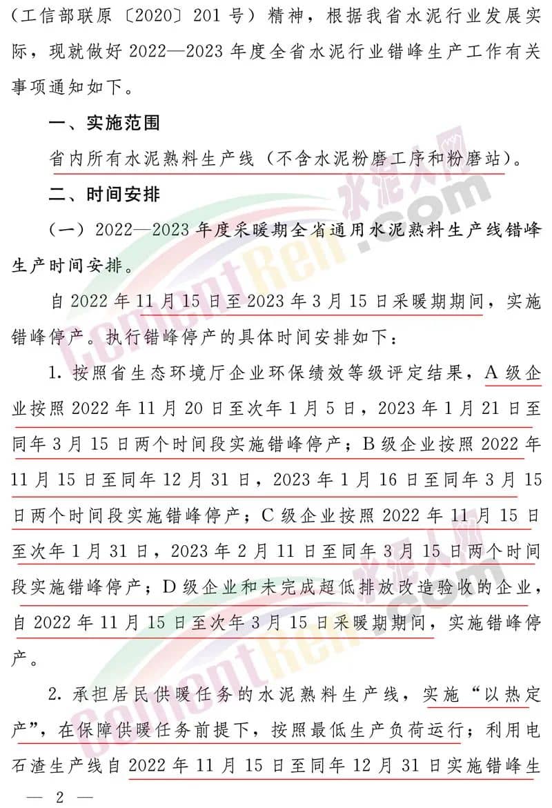 采暖期全省鋁酸鹽、硫鋁酸鹽、白色硅酸鹽水泥熟料生產線錯峰生產時間安排,自2022年11月15日至同年12月15日(31天),2023年1月15日至同年2月15日(32天)期間,按照上述兩個時間段實施錯峰停產。