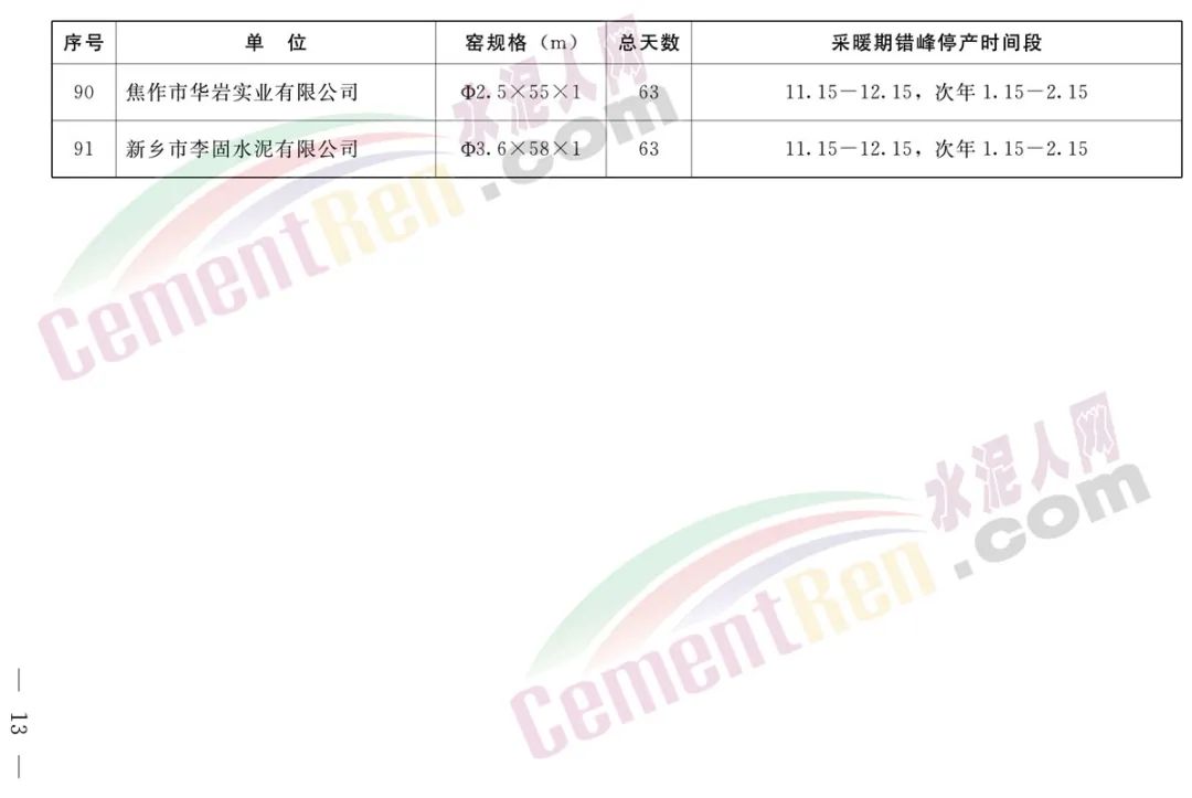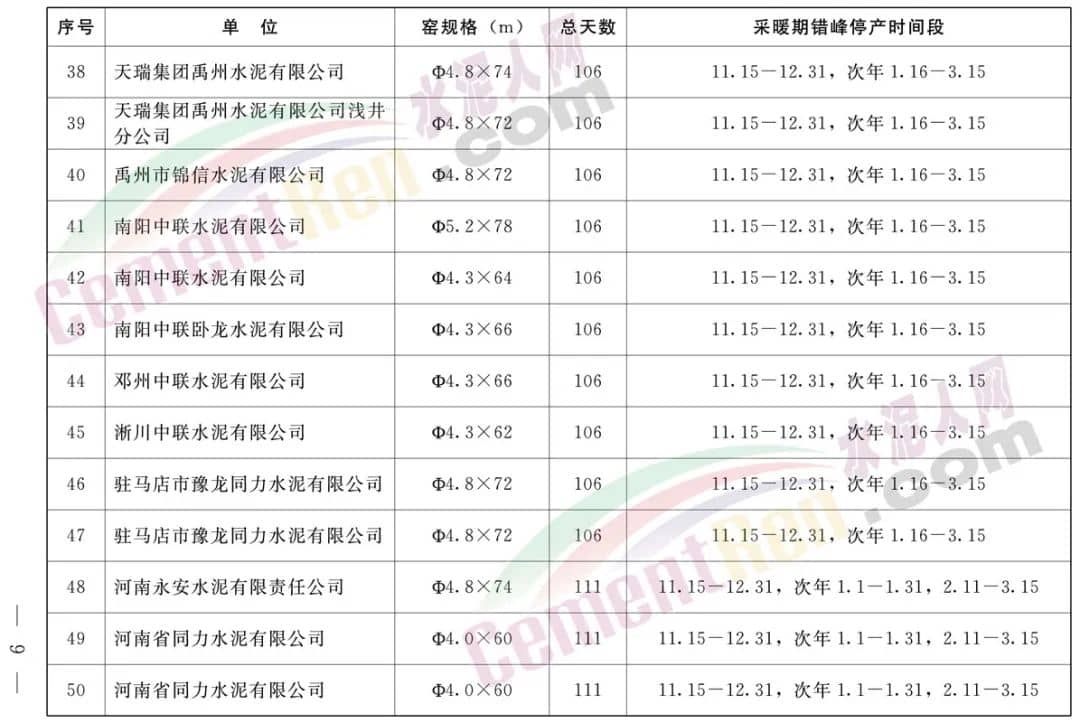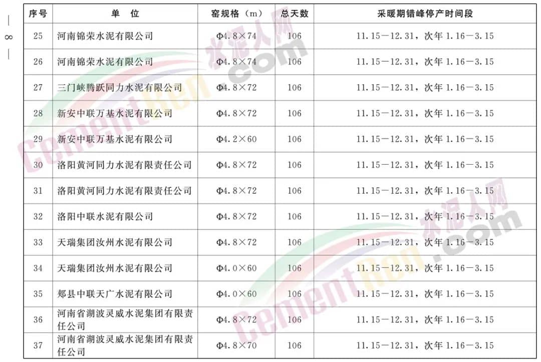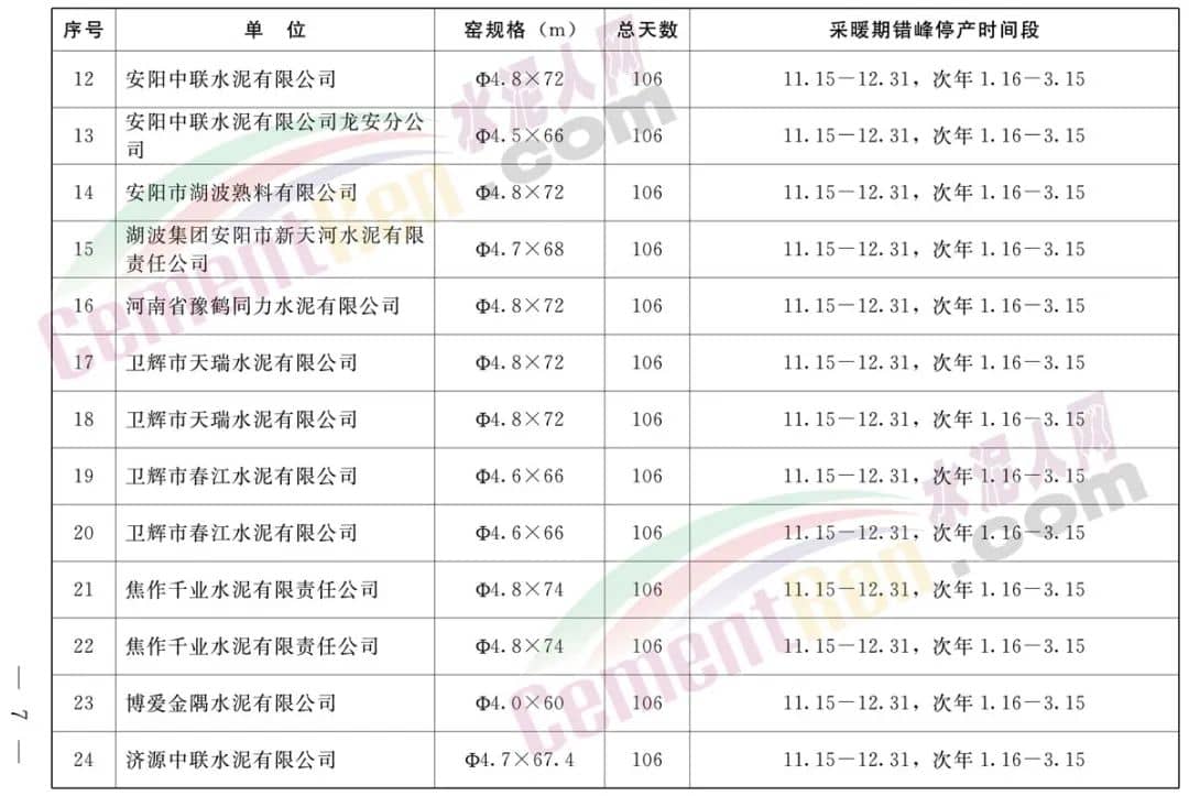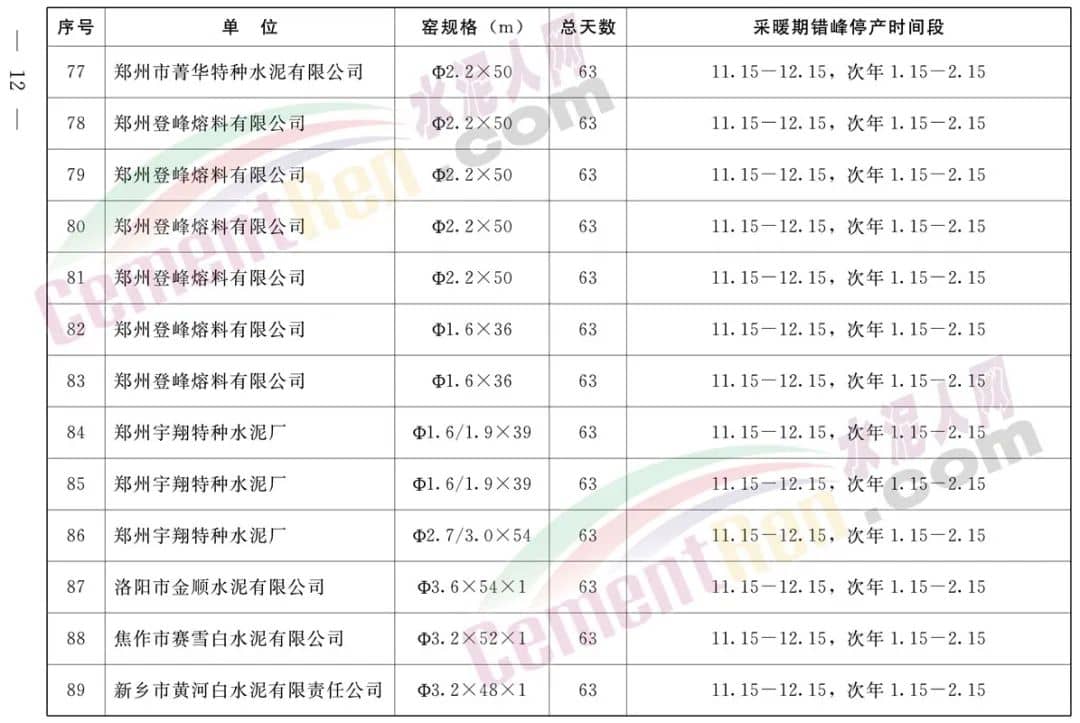 采暖期全省鋁酸鹽、硫鋁酸鹽、白色硅酸鹽水泥熟料生產線錯峰生產時間安排,自2022年11月15日至同年12月15日(31天),2023年1月15日至同年2月15日(32天)期間,按照上述兩個時間段實施錯峰停產。