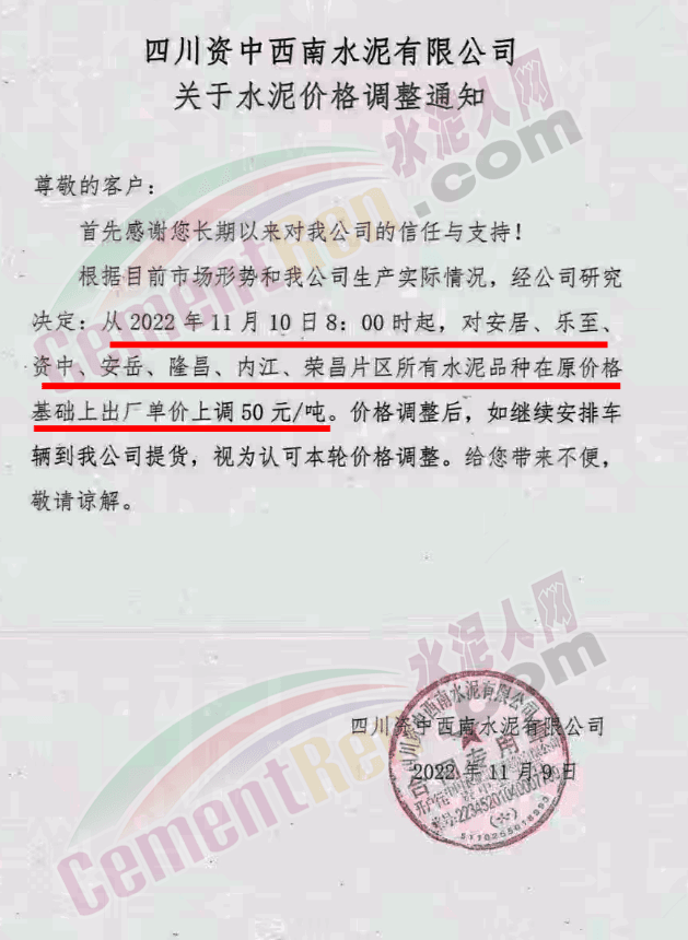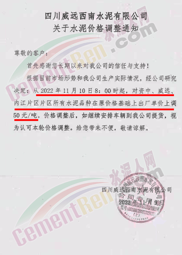 四川威遠(yuǎn)西南水泥通知,11月10日8時(shí)起,對(duì)資中、威遠(yuǎn)、內(nèi)江片區(qū)所有水泥品種出廠價(jià)上調(diào)50元/噸。