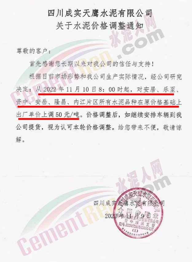 四川成實(shí)天鷹水泥有限公司通知,從11月10日8時(shí)起,對(duì)安居、樂(lè)至、資中、安岳、隆昌、內(nèi)江片區(qū)所有水泥品種出廠價(jià)上調(diào)50元/噸。