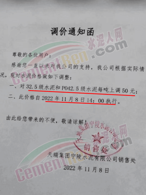 河南天瑞集團(tuán)寧陵水泥有限公司銷(xiāo)售處通知,自11月8日14時(shí)起對(duì)32.5級(jí)水泥和P.O42.5級(jí)水泥上調(diào)50元/噸。