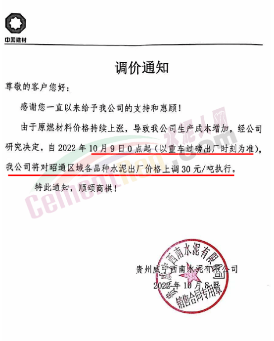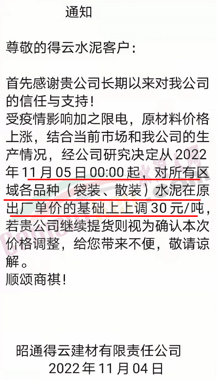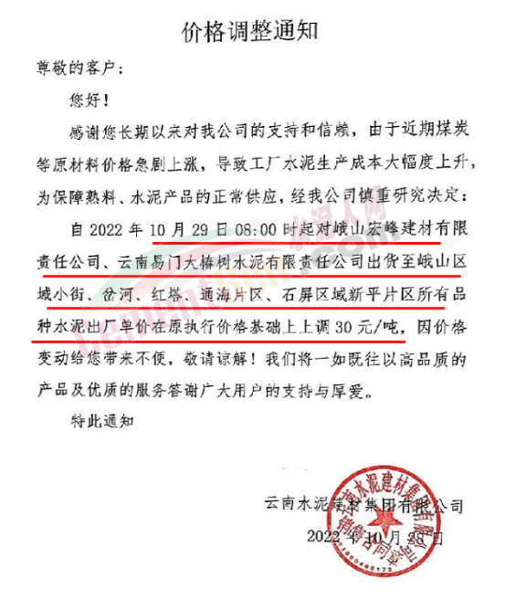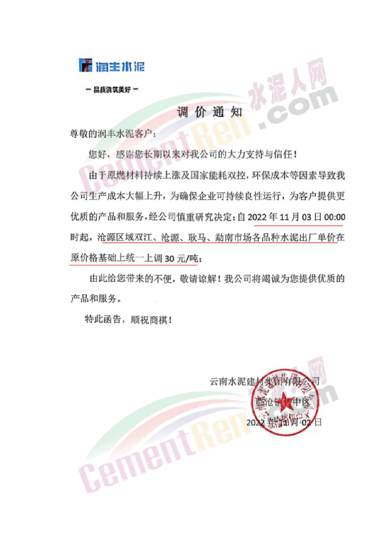 云南水泥建材集團(tuán)有限公司臨滄銷(xiāo)售中心通知,由于原燃材料持續(xù)上漲及國(guó)家能耗雙控,環(huán)保成本等因素導(dǎo)致公司生產(chǎn)成本大幅上升,為確保企業(yè)可持續(xù)良性運(yùn)行,為客戶提供更優(yōu)質(zhì)的產(chǎn)品和服務(wù),經(jīng)公司慎重研究決定,自2022年11月3日0時(shí)起,滄源區(qū)域雙江、滄源、耿馬、勐南市場(chǎng)各品種水泥出廠單價(jià)在原價(jià)格基礎(chǔ)上統(tǒng)一上調(diào)30元/噸。