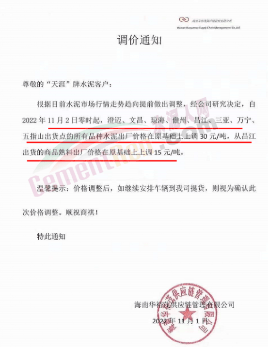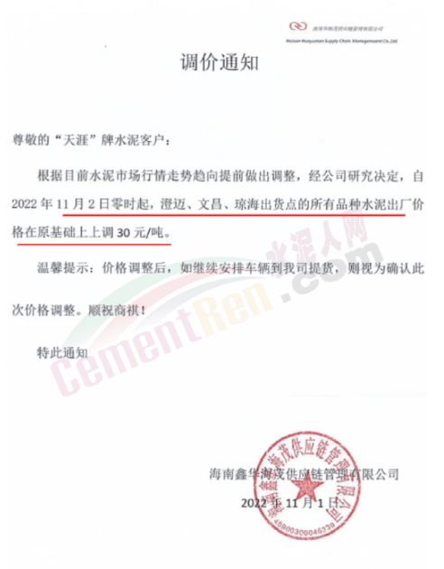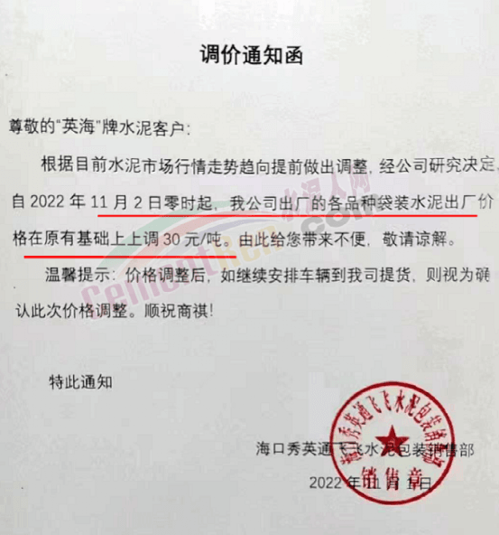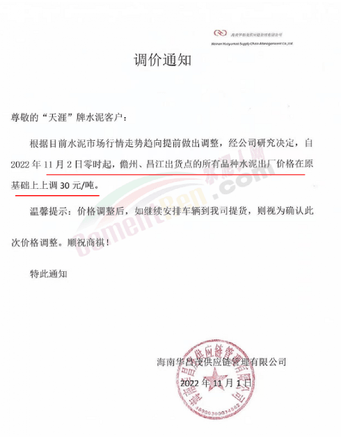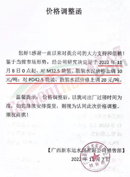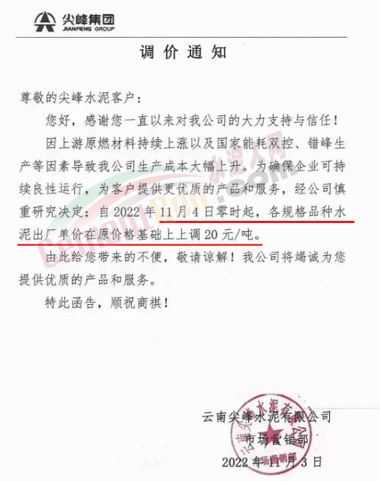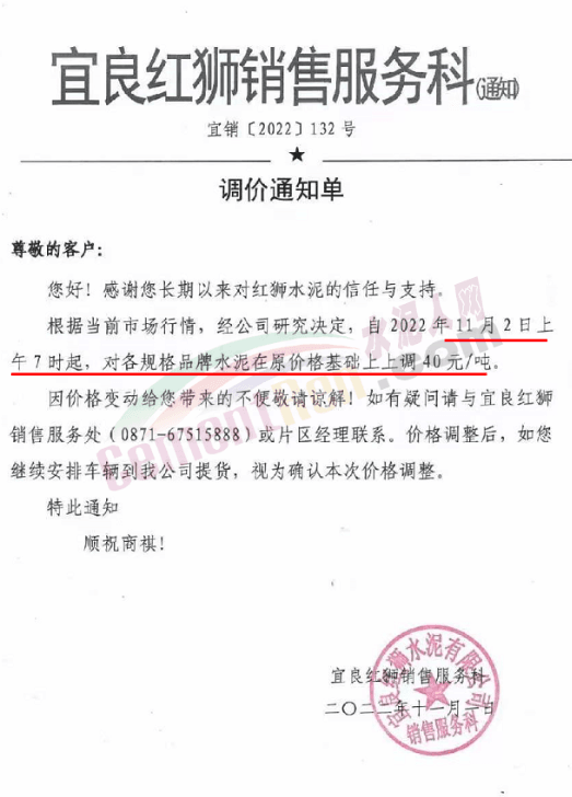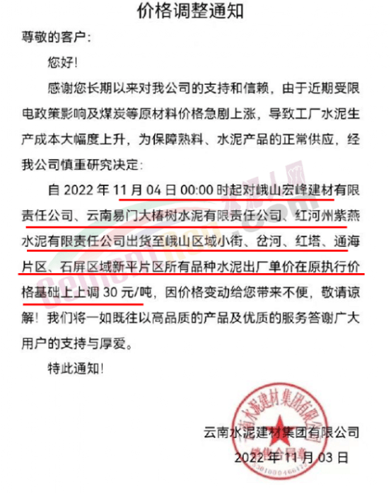 11月2日-3日昆明、楚雄地區(qū)通知上調(diào)水泥價(jià)格20-40元/噸;宜良紅獅銷(xiāo)售服務(wù)科通知,根據(jù)當(dāng)前市場(chǎng)行情,經(jīng)公司研究決定,自2022年11月2日上午7時(shí)起,對(duì)各規(guī)格品牌水泥在原價(jià)格基礎(chǔ)上上調(diào)40元/噸。