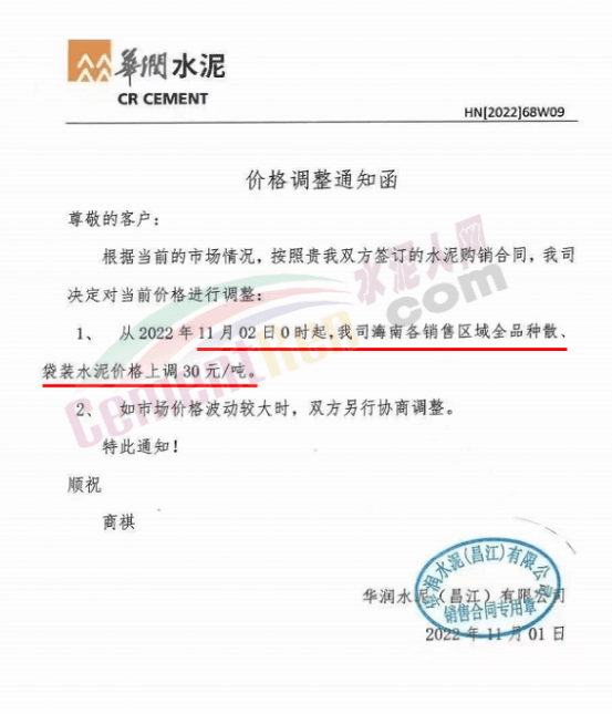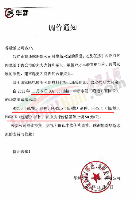華新水泥(紅河)有限公司通知,11月8日0時(shí)起,對(duì)所有品種水泥價(jià)格上調(diào)60元/噸。