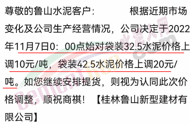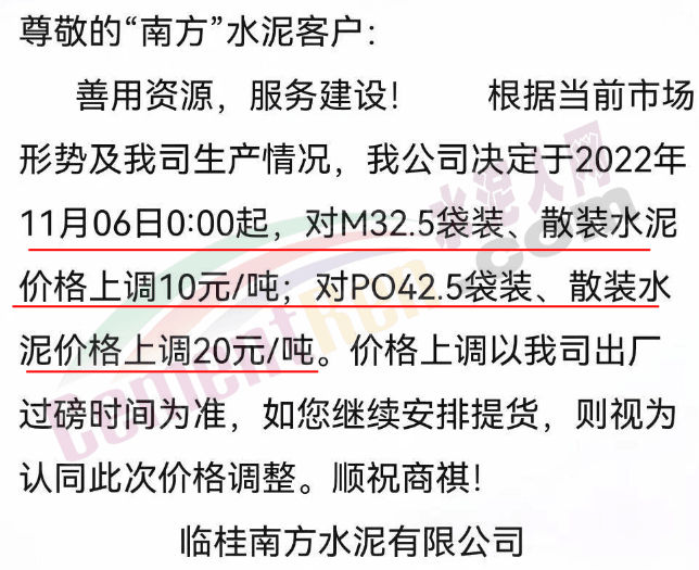 廣西桂林主要品牌企業(yè)通知11月6-7日起對(duì)M32.5袋裝、散裝水泥價(jià)格上調(diào)10元/噸對(duì)PO42.5袋裝、散裝水泥價(jià)格上調(diào)20元/噸。