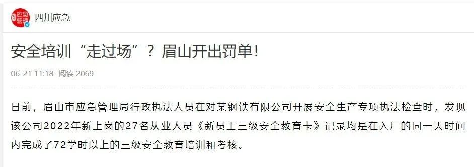 四川眉山市應(yīng)急管理局開展安全生產(chǎn)專項(xiàng)執(zhí)法檢查時(shí),發(fā)現(xiàn)某公司2022年新上崗的27名從業(yè)人員《新員工三級(jí)安全教育卡》記錄均是在入廠的同一天時(shí)間內(nèi)完成了72學(xué)時(shí)以上的三級(jí)安全教育培訓(xùn)和考核。