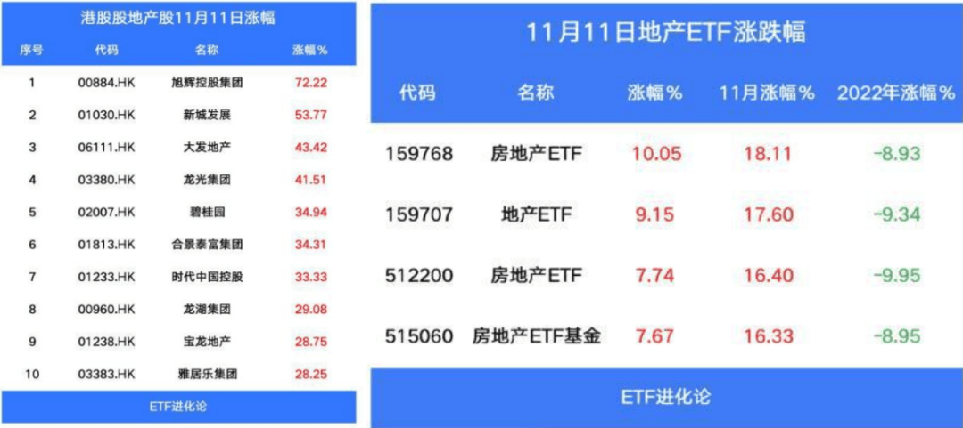 港股地產(chǎn)板塊漲幅驚人,旭輝控股漲72%,新城發(fā)展?jié)q超53%,龍光集團(tuán)漲超41%,碧桂園漲近35%;A股陽光城、綠地控股、華發(fā)股份、新城控股、保利發(fā)展、廣宇集團(tuán)、萬科A等多股漲停。房地產(chǎn)ETF漲幅達(dá)到10%,沖擊漲停板,地產(chǎn)ETF漲超9%,房地產(chǎn)ETF基金上漲7%。