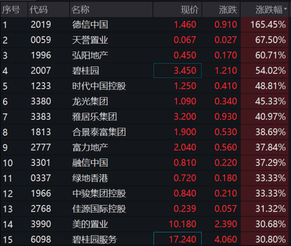 11月14日,內(nèi)地房地產(chǎn)指數(shù)漲超10%。德信中國(guó)漲超165%,天譽(yù)置業(yè)、弘陽地產(chǎn)漲超60%,碧桂園漲54%,時(shí)代中國(guó)控股、龍光集團(tuán)、雅居樂集團(tuán)漲超40%,富力地產(chǎn)、融信中國(guó)漲超35%,美的置業(yè)新城控股、龍湖集團(tuán)漲超20%。