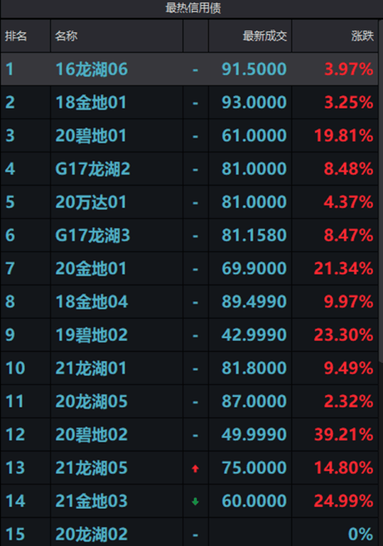 地產(chǎn)債大幅上漲,“20金地01”漲超21%,“20碧地01” “19碧地02”漲超19% ,“21龍湖05”漲近15%。