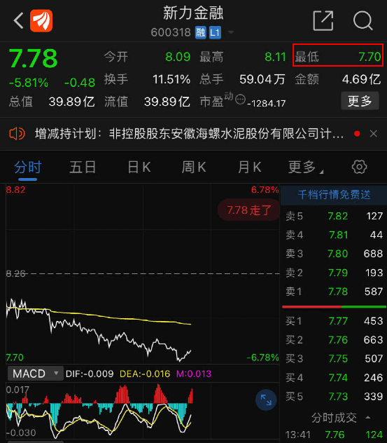16日新力金融股價持續(xù)下滑,盤中最低價跌止7.70元/股,下跌幅度超6%。