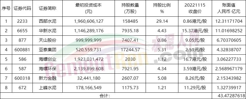 盤點海螺水泥持有的同行業(yè)股票可見,持有8家同行企業(yè)股票市值達43.47億元,西部水泥和華新水泥賬面值均達到10億元以上。