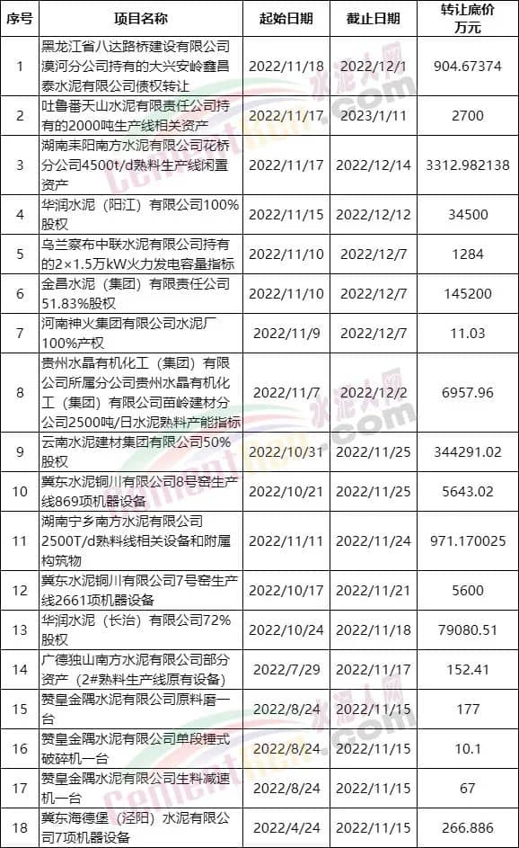 據(jù)水泥人網(wǎng)不完全統(tǒng)計(jì),全國產(chǎn)權(quán)行業(yè)信息化綜合服務(wù)平臺(tái)正在披露項(xiàng)目中包含18個(gè)水泥行業(yè)出讓項(xiàng)目。出讓標(biāo)的分別為股權(quán)、產(chǎn)權(quán)、資產(chǎn)、熟料指標(biāo)、火力發(fā)電容量指標(biāo)、生產(chǎn)設(shè)備以及附屬構(gòu)筑物等。涉及企業(yè)包括國內(nèi)主要品牌水漲企業(yè)華潤水泥、南方水泥、中聯(lián)水泥、金隅冀東等。