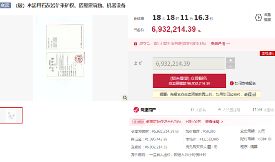 本次變賣標(biāo)的所指的標(biāo)的物,房屋建筑物、構(gòu)筑物及其他輔助設(shè)施、機(jī)器設(shè)備評(píng)估價(jià)值為301.49萬元,水泥用石灰?guī)r礦采礦權(quán)評(píng)估咨詢價(jià)值為865.14萬元,采礦權(quán)資源價(jià)款為86.7605萬元,合計(jì)1253.3905萬元。