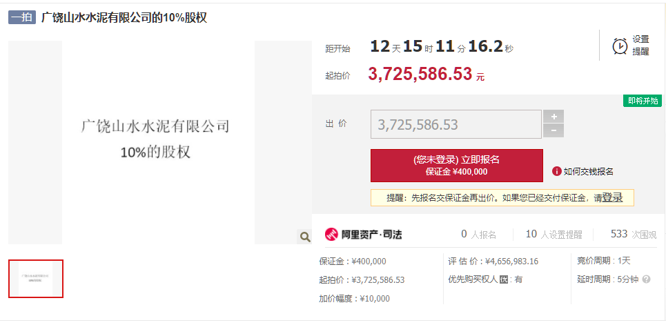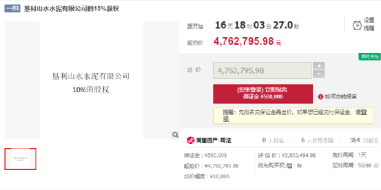 拍賣對象為勝利油田營海實(shí)業(yè)集團(tuán)有限公司所持有的在廣饒山水水泥有限公司的10%股權(quán)。評(píng)估價(jià):4656983.16元,起拍價(jià):3725586.53元,保證金:400000元,增價(jià)幅度:10000元。