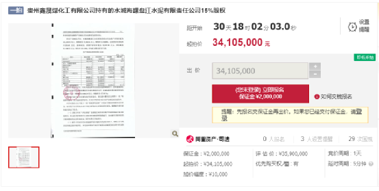 拍賣標(biāo)的為被執(zhí)行人貴州鑫晟煤化工有限公司持有的水城海螺盤江水泥有限責(zé)任公司15%股權(quán)。起拍價(jià):3410.5萬元,保證金:200萬元,增價(jià)幅度:10000元。