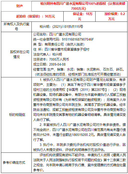 四川省成都市中級(jí)人民法院發(fā)布的公告文件中提到,拍賣標(biāo)的“興明持有四川廣建水泥有限公司100%的股權(quán)”為涉案財(cái)產(chǎn),起拍價(jià)為90萬元。