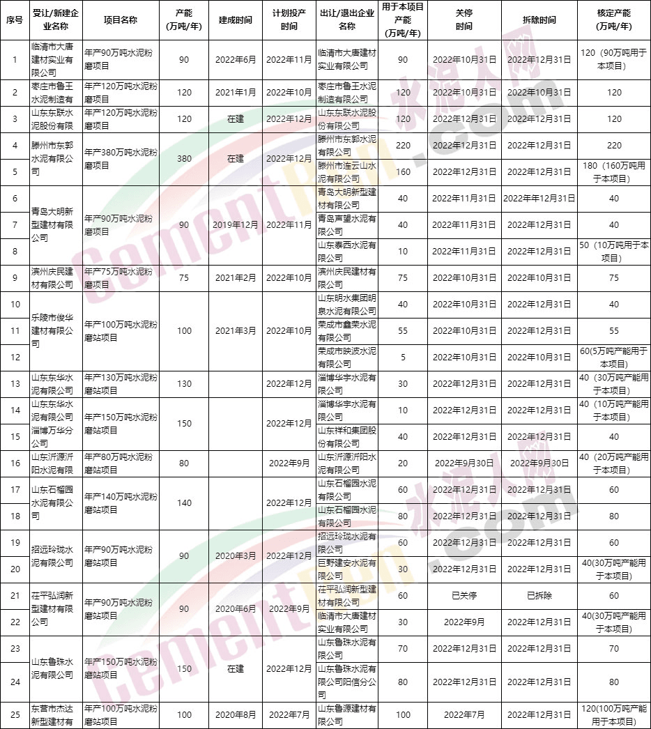 據(jù)水泥人網(wǎng)了解,類(lèi)似的“先上車(chē)后補(bǔ)票”式補(bǔ)齊產(chǎn)能,近年來(lái)并不少見(jiàn)。而且不僅見(jiàn)于熟料生產(chǎn)線。山東省7月份以來(lái)發(fā)布的粉磨站補(bǔ)充產(chǎn)能公告包含15個(gè)水泥粉磨項(xiàng)目。置換比例均為1:1,核定產(chǎn)能合計(jì)1905萬(wàn)噸/年。退出項(xiàng)目共25個(gè),合計(jì)退出1645萬(wàn)噸/年。