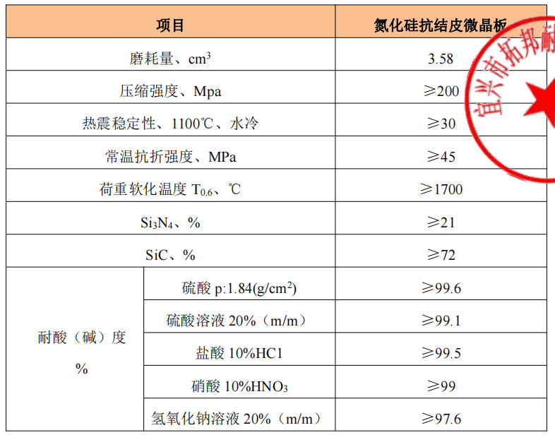 從以上數(shù)據(jù)可以看出,氮化硅微晶板具有高抗磨、高強(qiáng)度、耐侵蝕、抗結(jié)皮等性能,可廣泛使用于水泥窯煙室、五級下料管等易結(jié)皮、須耐磨部位。
