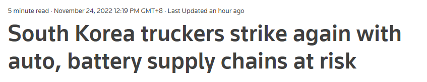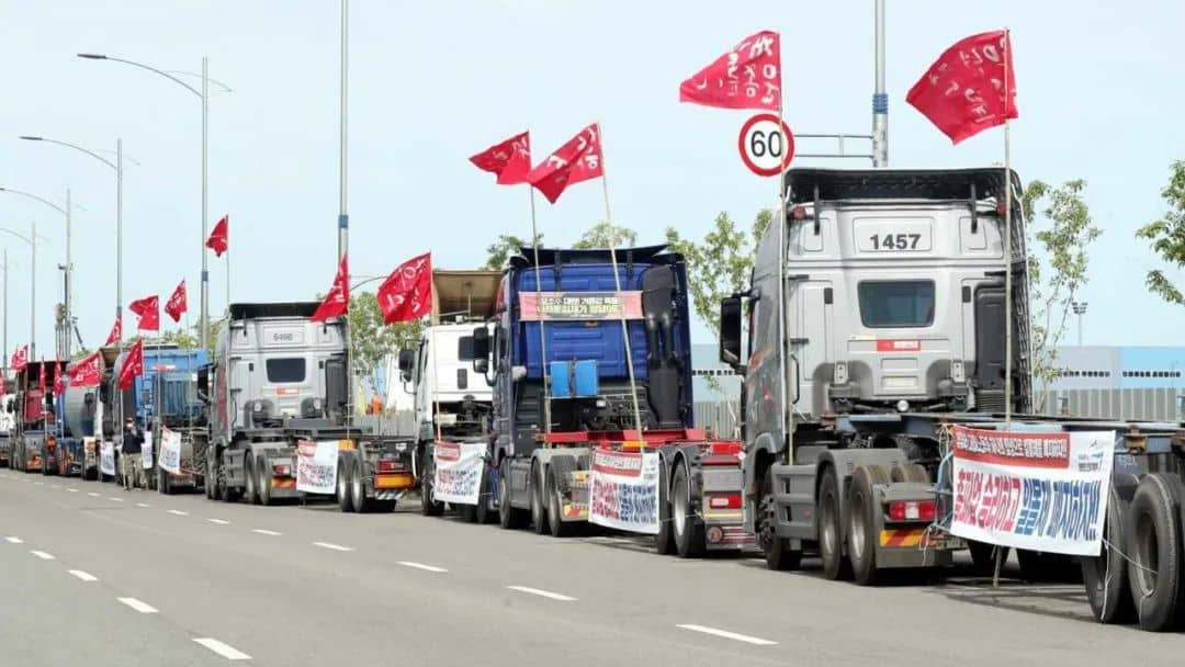 其實(shí),早在11月14日,韓國最大的工會組織之一民主勞動組合總聯(lián)盟旗下貨運(yùn)卡車工會(Cargo Truckers Solidarity)就宣布,將從11月23日午夜開始發(fā)動無限期罷工,大約2.5萬多名工會成員將通過封鎖鋼鐵、水泥、造船設(shè)備、汽車零部件等主要物流基地以及拒絕貨物運(yùn)輸?shù)确绞絽⒓恿T工。