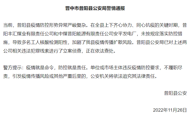 11月26昔陽(yáng)縣公安局通報(bào),昔陽(yáng)豐匯煤業(yè)有限責(zé)任公司和中煤昔陽(yáng)能源有限責(zé)任公司安平發(fā)電廠,未按規(guī)定落實(shí)防控措施,導(dǎo)致多名工人核酸檢測(cè)陽(yáng)性,加劇了當(dāng)?shù)匾咔閭鞑U(kuò)散風(fēng)險(xiǎn)。昔陽(yáng)縣公安局已對(duì)上述兩公司相關(guān)違法犯罪線索進(jìn)行了立案?jìng)刹椤?/p>