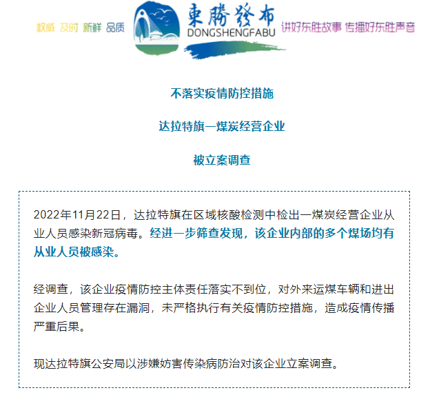 2022年11月22日,內(nèi)蒙古達(dá)拉特旗在區(qū)域核酸檢測(cè)中檢出一煤炭經(jīng)營(yíng)企業(yè)從業(yè)人員感染新冠病毒。經(jīng)進(jìn)一步篩查發(fā)現(xiàn),該企業(yè)內(nèi)部的多個(gè)煤場(chǎng)均有從業(yè)人員被感染。