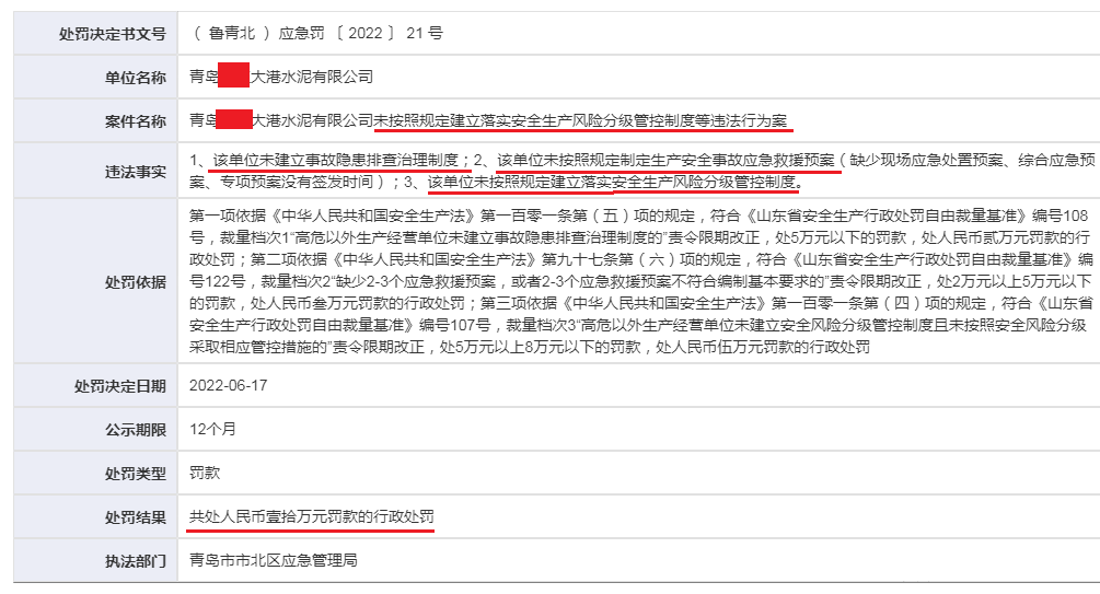 據(jù)青島市市北區(qū)應(yīng)急管理局的處罰決斷書,對(duì)青島某水泥有限公司未按照規(guī)定建立生產(chǎn)風(fēng)險(xiǎn)分級(jí)管控制度等行業(yè)案作出罰款10萬元的行政處罰。