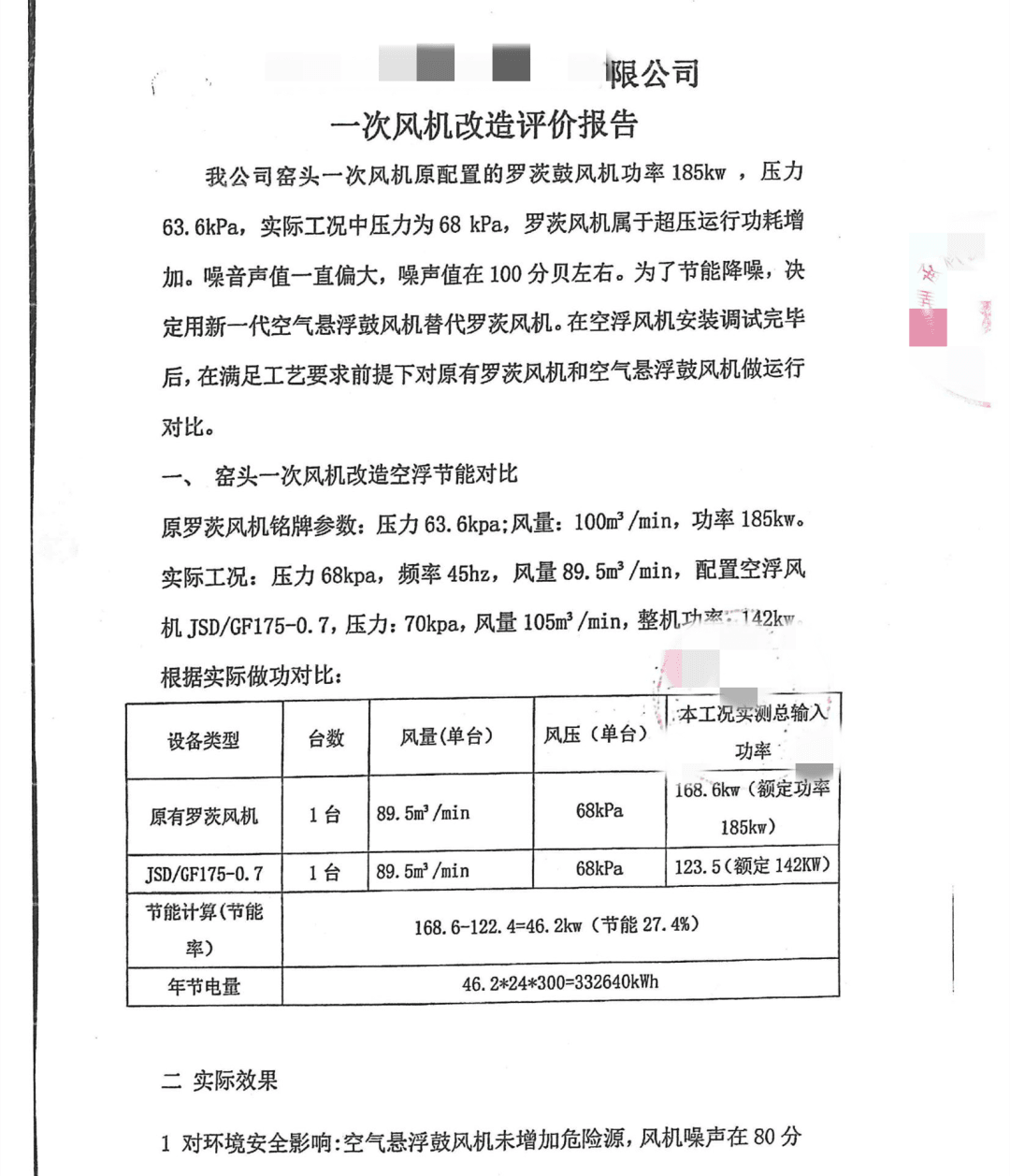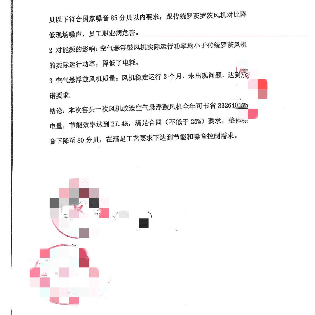 本次窯頭一次風(fēng)機(jī)改造空氣懸浮鼓風(fēng)機(jī)全年可節(jié)省332640kwh電量,節(jié)能效率達(dá)到27.4%,滿(mǎn)足合同(不低于25%)要求,整體噪音下降至80分貝,在滿(mǎn)足工藝要求下達(dá)到了節(jié)能和噪音控制需求。改造報(bào)告如下: