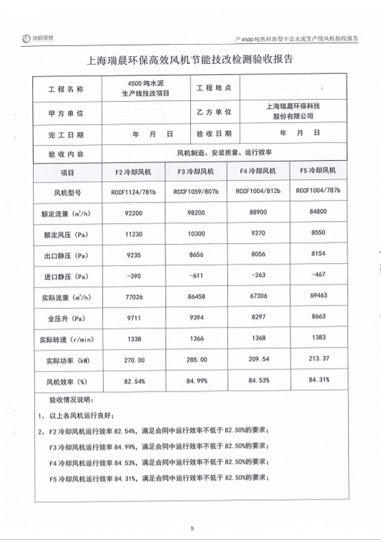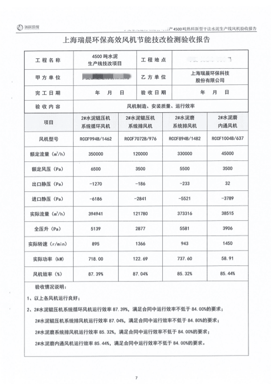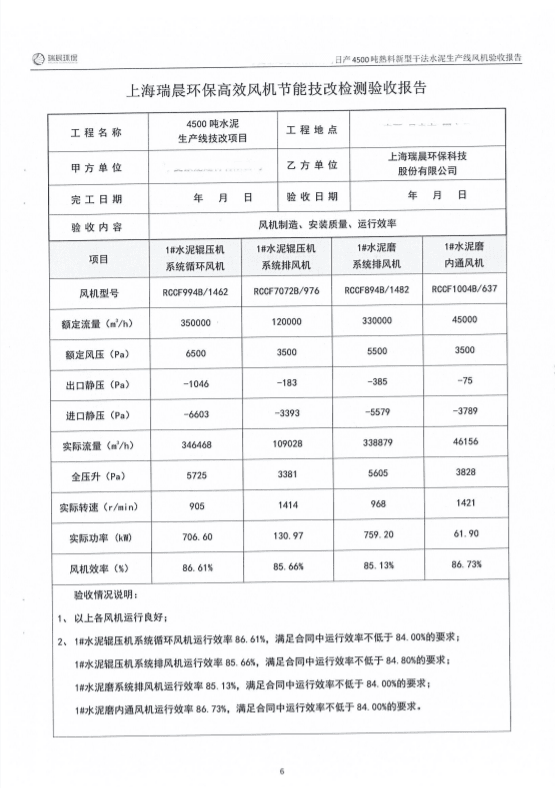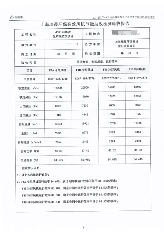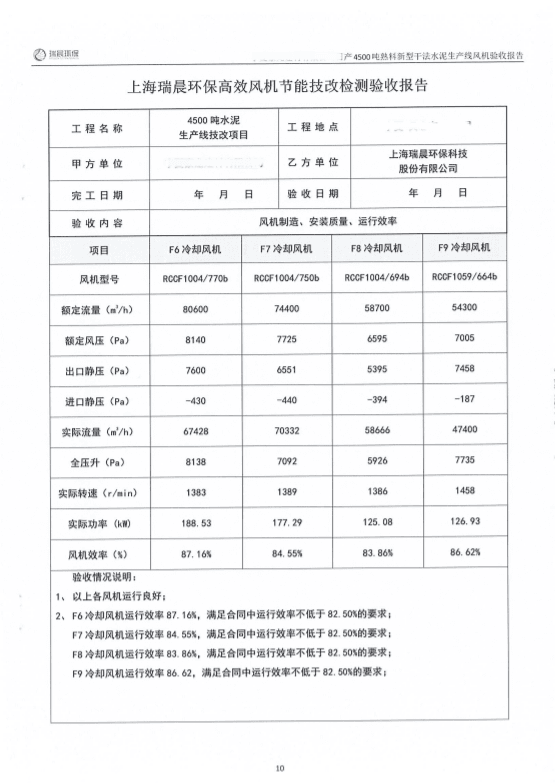 2022年8月,該水泥企業(yè)組織雙方共同對全線風機進行了聯(lián)合驗收測試。測試結果顯示,風機運行良好,實測效率優(yōu)于合同約定效率,達到雙方約定的驗收指標,風機單耗低,使用效果好。
