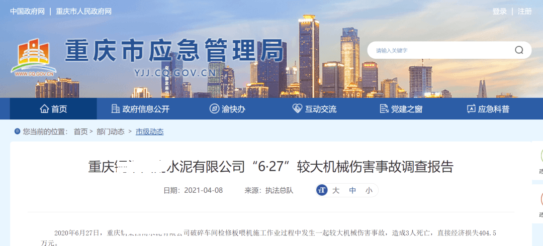 2020年6月27日,重慶銅梁某水泥有限公司破碎車間檢修板喂機(jī)施工作業(yè)過(guò)程中發(fā)生一起較大機(jī)械傷害事故,造成3人死亡,直接經(jīng)濟(jì)損失404.5萬(wàn)元。