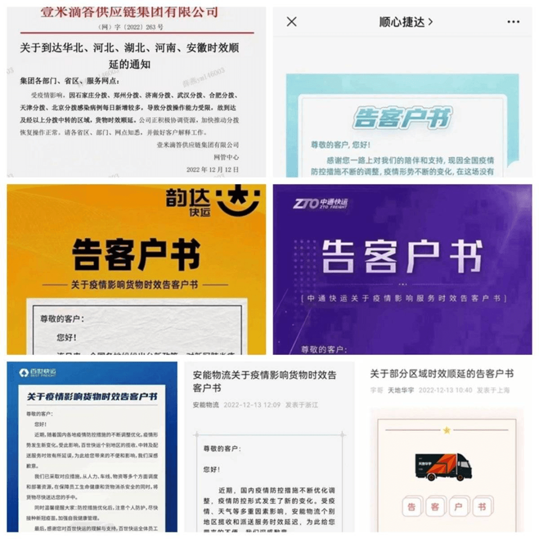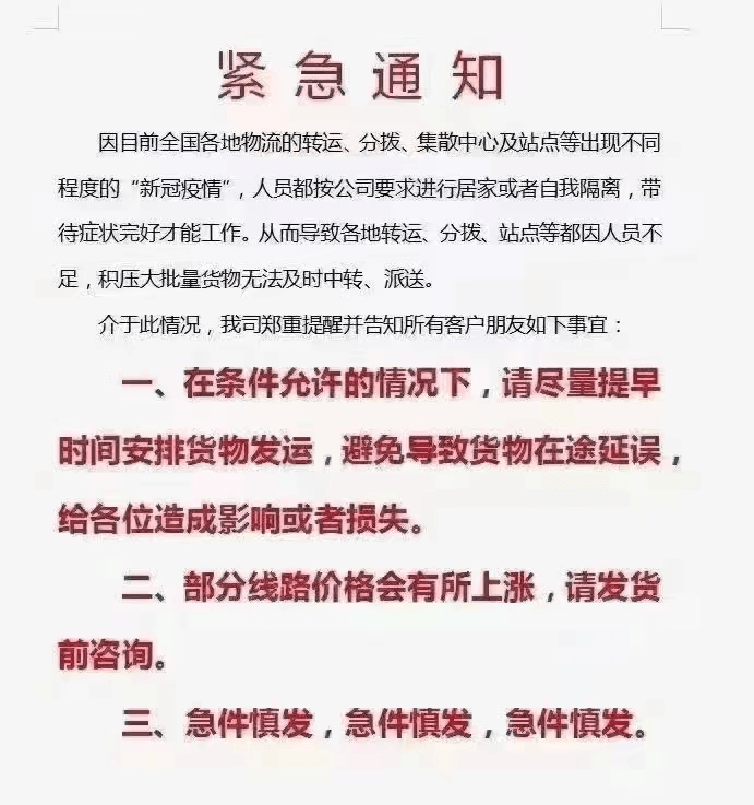 因疫情影響,順心捷達(dá)、安能物流、中通快運(yùn)、百世快運(yùn)、韻達(dá)快運(yùn)、壹米滴答、華宇物流等快運(yùn)公司相繼發(fā)布了告客戶書(shū),告訴客戶受疫情影響比較嚴(yán)重,可能會(huì)出現(xiàn)送發(fā)貨不及時(shí)甚至部分地區(qū)不發(fā)貨情況。