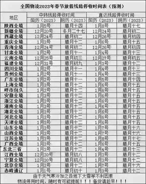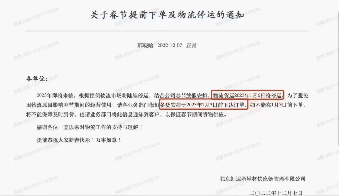 北京虹運(yùn)基輔材供應(yīng)鏈管理有限公司通知,綜合公司春節(jié)放假安排,物流貨運(yùn)2023年1月6日將停運(yùn),請(qǐng)各業(yè)務(wù)部門2023年1月3日前下達(dá)訂單,如果不能在1月3日前下單,將不能保障及時(shí)到貨。