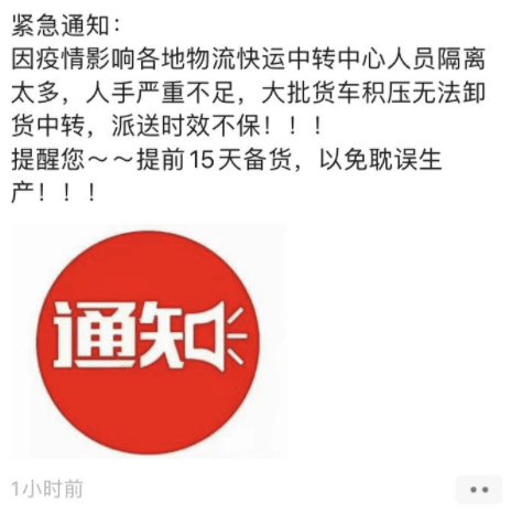 另一企業(yè)發(fā)緊急通知稱:“因疫情影響各地物流快運(yùn)中轉(zhuǎn)中心人員隔離太多,人手嚴(yán)重不足,大批貨車積壓無(wú)法卸貨中轉(zhuǎn),派送時(shí)效不保!!!提醒您:提前15天備貨,以免耽誤生產(chǎn)!”