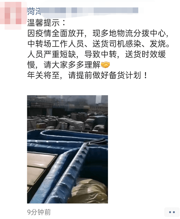 山東菏澤一企業(yè)溫馨提示稱:“因疫情全面放開(kāi),現(xiàn)多地物流分撥中心中轉(zhuǎn)場(chǎng)工作人員、送貨司機(jī)感染、發(fā)燒人員嚴(yán)重短缺,導(dǎo)致中轉(zhuǎn),送貨時(shí)效緩慢,請(qǐng)大家多多理解個(gè)年關(guān)將至,請(qǐng)?zhí)崆白龊脗湄浻?jì)劃!”