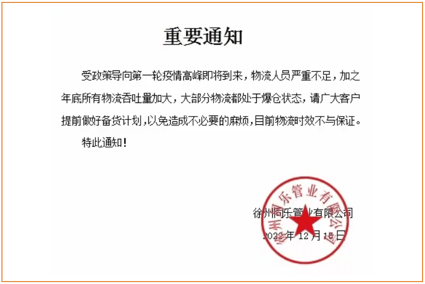 徐州同樂(lè)管業(yè)重要通知:“受政策導(dǎo)向第一輪疫情高峰即將到來(lái),物流人員嚴(yán)重不足,加之年底所有物流吞吐量加大,大部分物流都處于爆倉(cāng)狀態(tài),請(qǐng)廣大客戶提前做好備貨計(jì)劃,以免造成不必要的麻煩,目前物流時(shí)效不保證。”