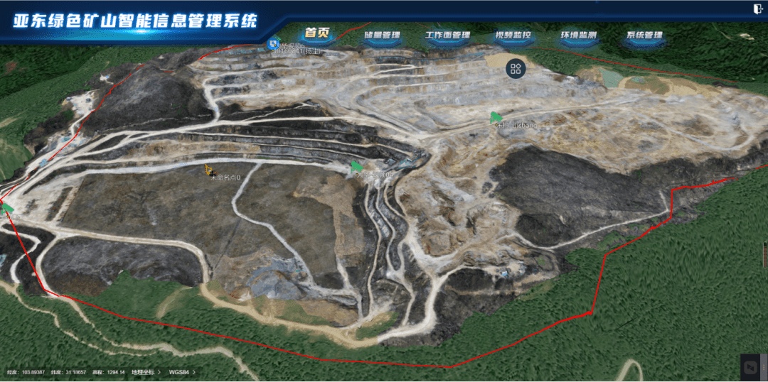 為了精準開采、綠色開采,亞東水泥建成了黃岡亞東、江西亞東及四川亞東礦山三維可視化系統(tǒng)模組,提供礦山可視化展示效果,全方位展示礦山采區(qū)生產(chǎn)信息、復墾綠化及環(huán)境監(jiān)測(粉塵、噪音等)等內容。三維分析測量工具可減少生產(chǎn)中的測量作業(yè)工作,模型高程和水平量測精度優(yōu)于10cm/像素點,可以達到 1:500 比例尺的精度,提高工作效率。