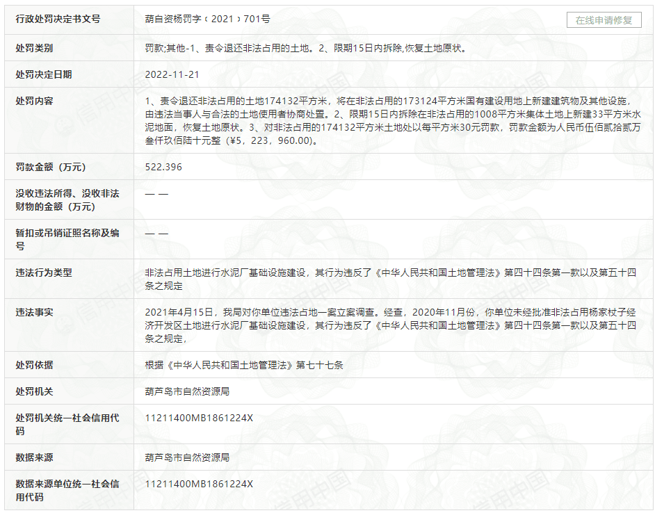 冀東水泥葫蘆島有限責任公司因未經(jīng)批準非法占用楊家杖子經(jīng)濟開發(fā)區(qū)土地進行水泥廠基礎(chǔ)設(shè)施建設(shè),違反了《土地管理法》。11月21日被葫蘆島市自然資源局一次性罰款522.396萬元。并要求其退還土地,拆除已建地面,恢復(fù)土地原狀。