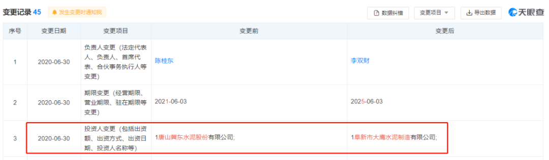 早在2020年6月30日企業(yè)投資人由唐山冀東水泥股份有限公司變更為阜新市大鷹水泥制造有限公司。企業(yè)法人也由陳桂東變更為李雙財。