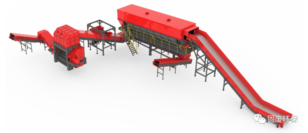 該系統(tǒng)先將待破碎的生活垃圾送至一級破碎進(jìn)行粗碎,再將破碎后的物料經(jīng)過篩分、磁選、風(fēng)選等精細(xì)化處理工藝,得到可利用的金屬、輕物質(zhì)和重物質(zhì);其中輕物質(zhì)被繼續(xù)輸送至二級破碎進(jìn)行細(xì)碎,最終得到粒狀98%小于30-80mm的可回收利用資源。