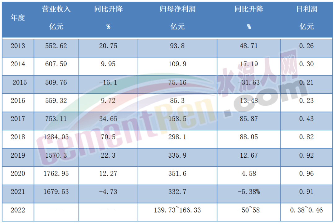回顧海螺水泥近10年的歷史業(yè)績可見2019~2021三年間,其日賺利潤均達到9000萬以上。2017年日均利潤4300萬與2022年相當,海螺業(yè)績一夜回到五年前。