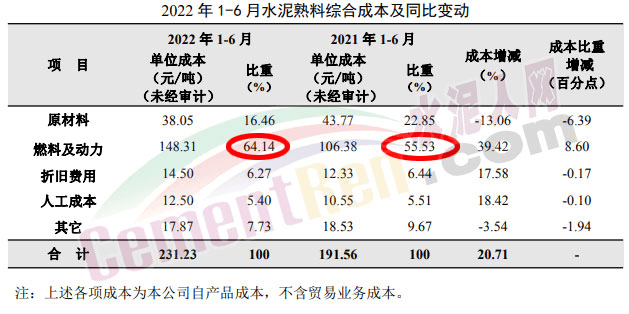 煤價上漲導(dǎo)致包括海螺水泥在內(nèi)的能源消費大戶成本上漲,海螺水泥2022年半年報顯示,燃料及動力占費用成本的64%,而且呈增長的趨勢。2020年的燃料成本占比為53%,2021年是55%。